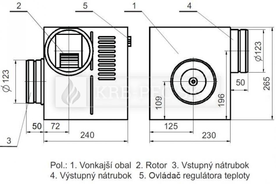 Teplovzdušný ventilátor je určený na rozvod teplého vzduchu (až do 150°C) zo sopúchu nad krbovou vložkou do rôznych miestností v budove. Je vybavený tepelne a zvukovo izolovaným ventilátorom a termostatom s rozsahom nastavenia od 10-150°C. Ak teplota na termostate dosiahne nastavenú hodnotu, ventilátor začína pracovať a spôsobí, že zohriaty vzduch sa začne hýbať. Ak je teplota pod nastavenou hodnotou, ventilátor sa automaticky vypína. (napríklad ak v krbe nehorí).