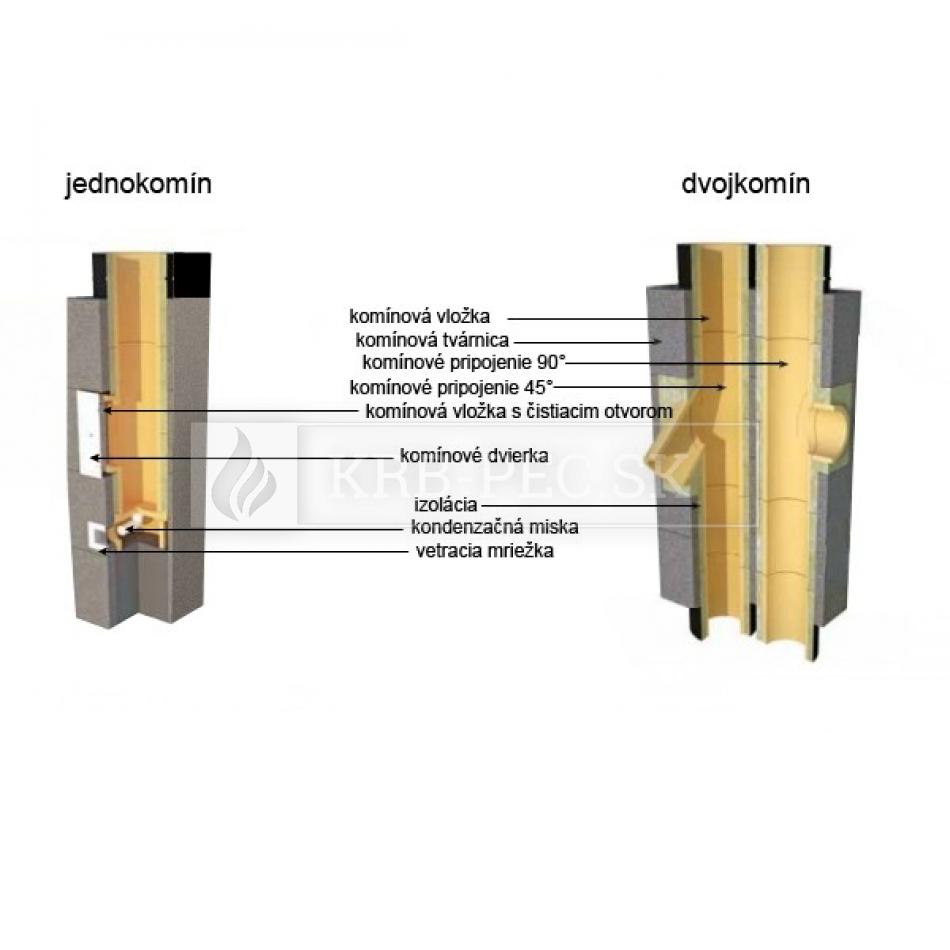 ![]() | Zostava vysoko kvalitného trojvrstvového jednoprieduchového komínového systému z prefabrikovaných tvárnic od slovenského výrobcu Stadreko. Komín je možno vybudovať v interiéri, ako aj v exteriéry. Má zadné odvetrávanie a účinnú stabilizáciu vnútorných lisovaných šamotových vložiek. Komínové tvárnice sa vyrábajú z prírodného keramzitu technológiou vibrolisovania. Zvýšená hrúbka stien zabezpečuje maximálnu možnú tepelnú a akustickú izoláciu s možnosťou vetrania vnútorného priestoru komína. Vysoká odolnosť voči kyselninám, kondenzátom a teplotným šokom 1000 °C v priebehu 30 min. |