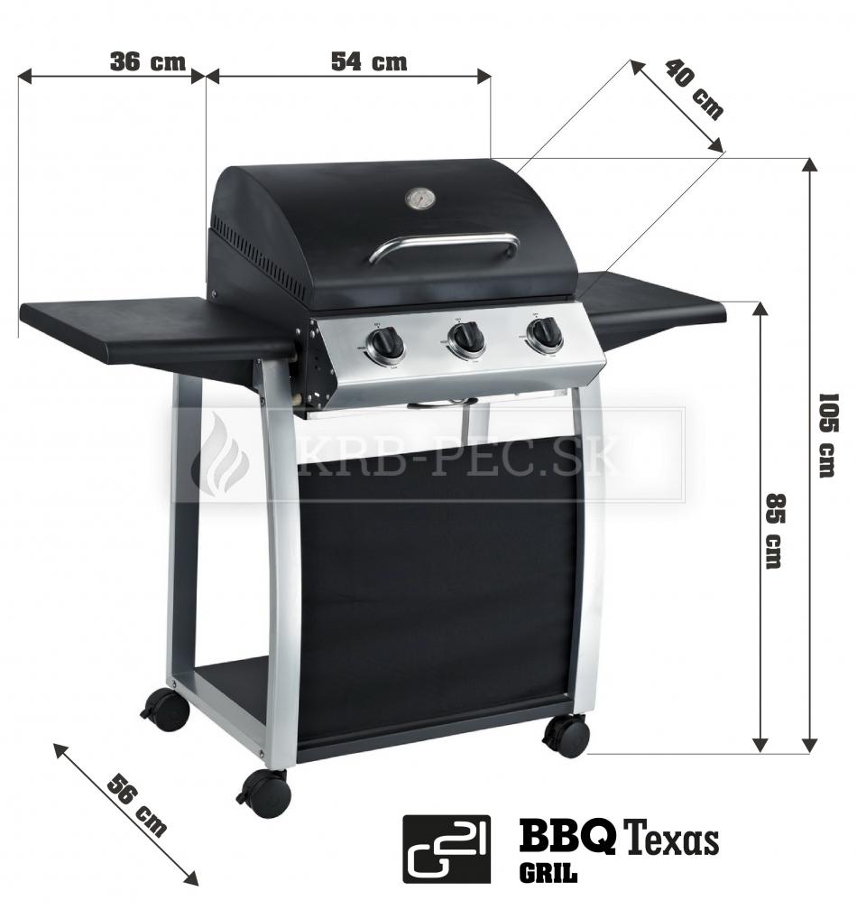 Záhradný plynový gril G21 Texas je vybavený systémom Flame Tamer, dvoma hlavnými nerezovými horákmi s piezoelektrickým zapaľovaním a plynovou reguláciou, každý s maximálnym výkonom 3,15 kW. Gril je pojazdný (má 2 kolieska), ďalej je vybavený teplomerom, odklápacím krytom grilovacej plochy a odkladacími drevenými poličkami na oboch stranách.