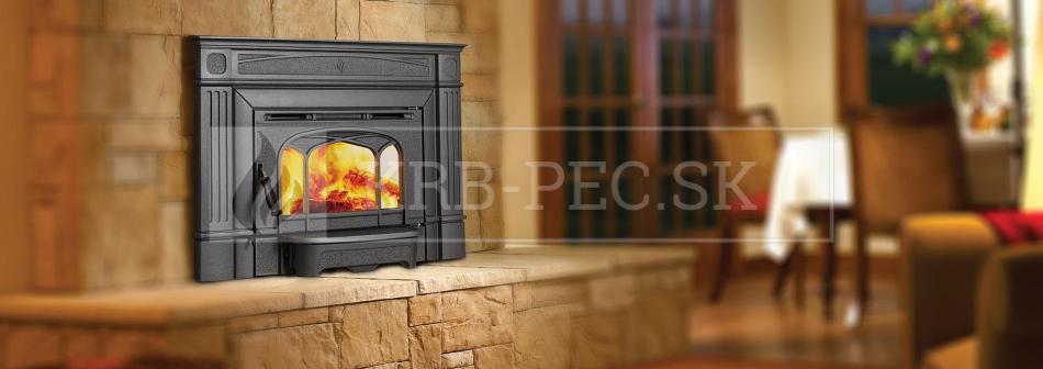 -Kanadský krb. Kúrenie veľkých priestorov jedným krbom, energetická trieda A, dvojstupňové spaľovanie, systém AirWash, hrubé vykurovacie teleso so šamotovým ohniskom, kovové čierne prevedenie, doživotná záruka na teleso.