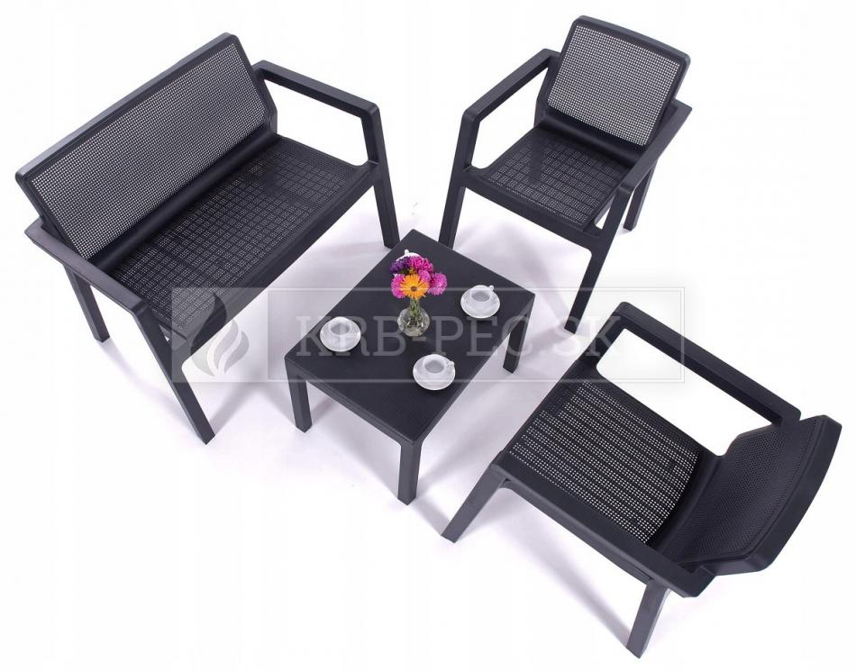 -Balkónový set nábytku (2 stoličky + stôl + sedačka) v grafitoverj farbe z odolnej umelej živice vyrobenej z recyklovaných materiálov s imitáciou prírodného ratanu. Neblednúca fabra vďaka UV ochrane, odolnosť voči počasiu, ľahká presúvateľnosť a skladovateľnosť a montáž.