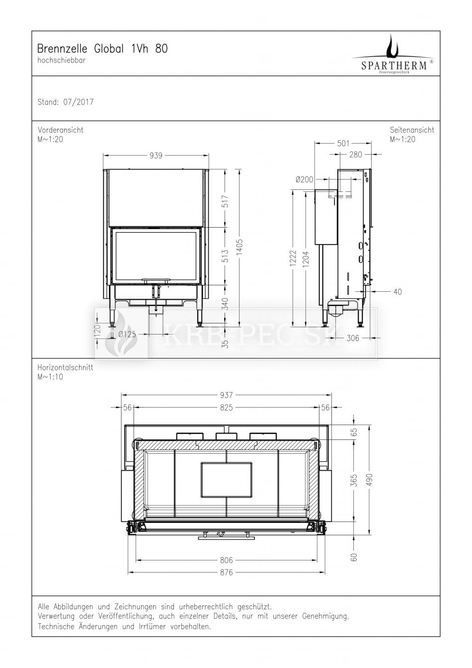 Spartherm Global 1Vh 80 krbová vložka. Oceľová konštrukcia, výsteľka šamot a vermiculit, dizajnové rovné sklo, nemecká kvalita, výsuvné dvierka